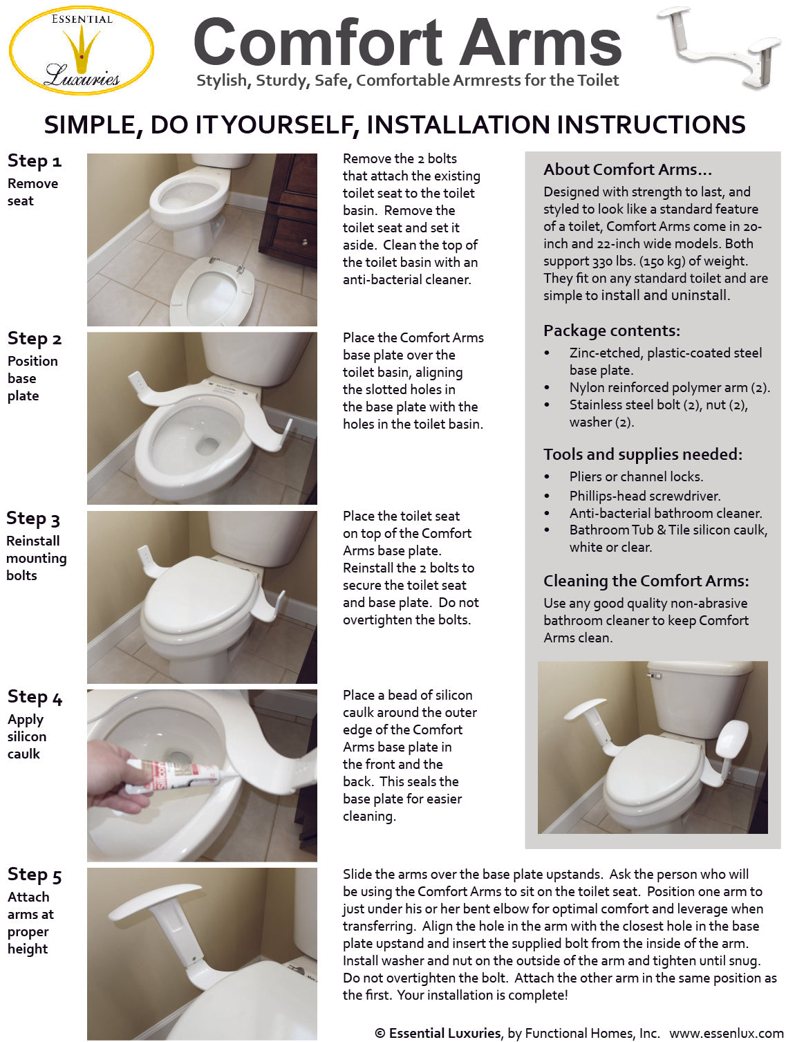 - Attachment: Base plates feature two slotted holes to the rear based on the standard width of 6.1 in. (155mm) for toilet seat fixings. Please check measurement before ordering as some US pans differ from this dimension. Comfort Arms are secured to the toilet seat pan with nylon or metal fixing bolts normally supplied with the toilet seat. Two stainless steel bolts (supplied with Comfort Arms) secure the arms into position. There are three selectable height positions.